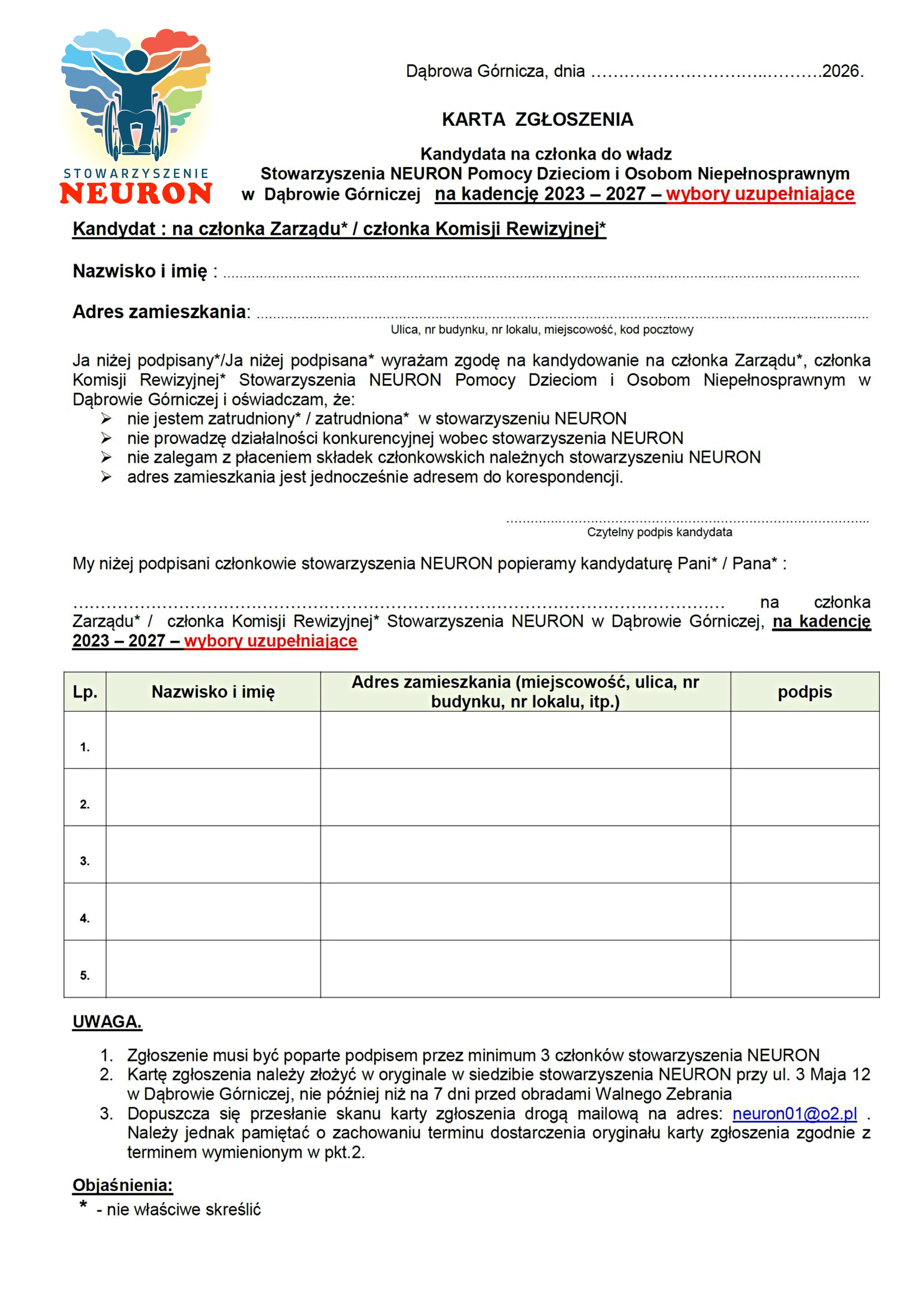 Członkowie zainteresowani kandydowaniem do Zarządu Stowarzyszenia NEURON lub Komisji Rewizyjnej proszeni są o wypełnienie karty zgłoszenia kandydata i przekazanie jej Zarządowi najpóźniej do dnia 16 marca 2026 r. Dokument stanowi Załącznik nr 1 do niniejszego ogłoszenia.