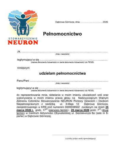 Wzory dokumentów można również odebrać w siedzibie Stowarzyszenia NEURON podczas dyżurów członków Zarządu, które odbywają się w każdy poniedziałek.