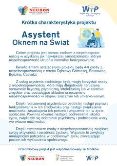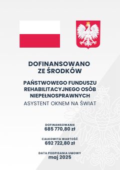 Projekt „Asystent oknem na świat” współfinansowany jest ze środków publicznych. Realizowany jest z poszanowaniem zasad dostępności, równości i otwartości na różnorodność.