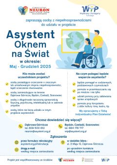 Z przyjemnością informujemy, że nasza organizacja – we współpracy z Fundacją Wspieramy i Pomagamy z Katowic – rozpoczęła w miesiącu Maj realizację projektu „ASYSTENT OKNEM NA ŚWIAT”, który potrwa do grudnia 2025 roku.